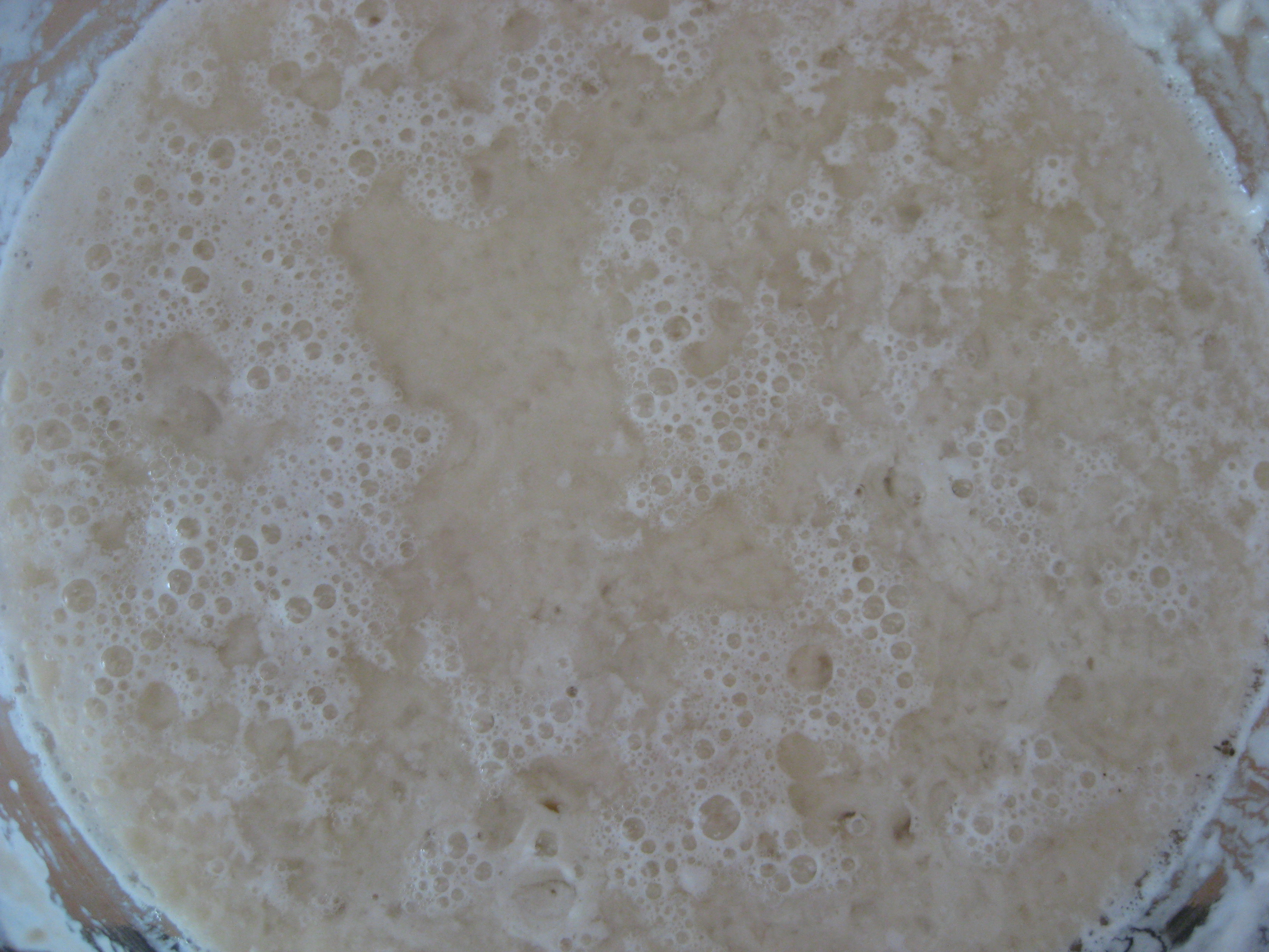 3.  To the one cup of bubbly starter in the mixing bowl, add 3 cups of flour and 1 cup of water.  Stir, cover and leave for 12-24 hours until it is really puffy.