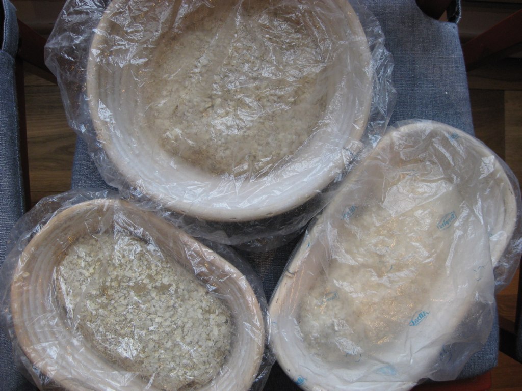 Showerhats. Seriously. They are brilliant as covers to let the dough rise either in the bowl or in the tin/basket. They are elasticated, they are reasonably air tight. Don’t spend a fortune. Buy them in bulk on amazon or start taking them from hotel bathrooms. That’s three different kinds of sourdough rising, by the way.