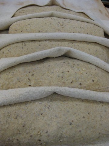 The couche. This is a fancy name for a piece of cloth on which you proof things like baguettes and ciabatta. You do not need to go to france to buy it. You can nip along to a fabric store and buy poplin. This is what dressmakers use to make patters and sew practice garments before they cut up the really expensive fabric. Get nice thick cotton or linen. It’s super cheap. Don’t those whole meal baguettes look great?