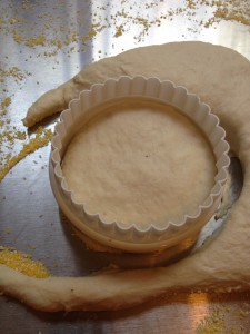 - Scatter some coarse corn meal or semolina on the counter and place the dough on top. Flour the top with a bit of flour and roll the dough out to about 2 cm in thickness. Using an 8 cm (or so) cutter with straight sides, cut out the muffins.