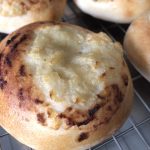 To make the final shape, use the palm of your hand to flatten the discs again and then, use your fingers to press (super firm pressing) a large, flat hollow in the centre of each of the discs of dough. You want each disc to have a large, round indentation where the dough on the bottom is extremely thin, leaving a fatter edge. Imagine tiny little pizzas. Use a brush to brush each piece of dough thoroughly with the egg wash. Using a spoon, place some of the minced onion into the centre of each piece of dough and then spread it out to fill the hollow. Pop the trays in the oven and bake them for 15 minutes or so. They should puff up and be nice and brown. Cool completely on a wire rack.